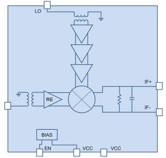MG1000是一款适用于高线性接收机的高集成度混频器芯片,工作频率从400MHz到4GHz,供电电压从3.3V到5V。本芯片的本振驱动采用多级缓冲放大器,片内集成的宽带变压器为射频和本振提供50Ω单端输入。对于射频端口,从1GHz到3GHz实现片内到 50Ω的匹配;对于本振端口,可达到片内从0.8GHz 到4.3GHz 的50Ω的匹配,无须外接匹配电路。如需扩展应用范围,只要简单的片外匹配即可。另外,中频输出为差分结构,非常方便接片外差分中频滤波器或放大器,如要50Ω单端输出,只需采用传统LC巴伦电路或者射频变压器,最大中频输出频率可达1000MHz。